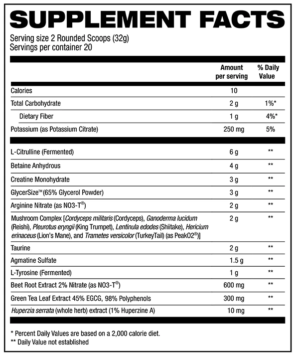 Next up is the power and endurance matrix featuring scientifically validated ingredients Creatine Monohydrate, Betaine Anhydrous, Taurine & PeakO2®. Creatine aids in the production of ATP and pairs perfectly with a monstrous 4 gram dose of Betaine Anhydrous to increase muscle power and help you push out those extra reps. Hosstile Bloodshot also delivers an endurance blend of PeakO2®; a patented mushroom blend created to increase oxygen intake, along with a clinical dose of Taurine to aid hydration and electrolyte balance – a perfect combination allowing you to train harder for longer.