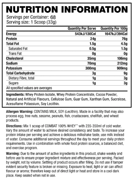 - Quickly absorb this protein. Combat 100% Whey is fast absorbed, which will give you the benefits of this great supplement straightaway. You can have it before or after your workout for an instant hit of protein.