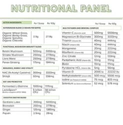 Under Eating Fruits and Vegetables – A 2,500 mg blend of Super Greens including Organic Spirulina, Cholera, Wheat Grass, and Barley Grass.