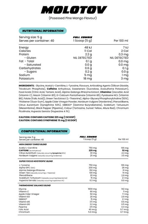 Molotov contains nutrients like GBBGO (Gamma-Butyrobetaine Hydrochloride) & Piperine to support thermogenesis and fire things up.
